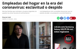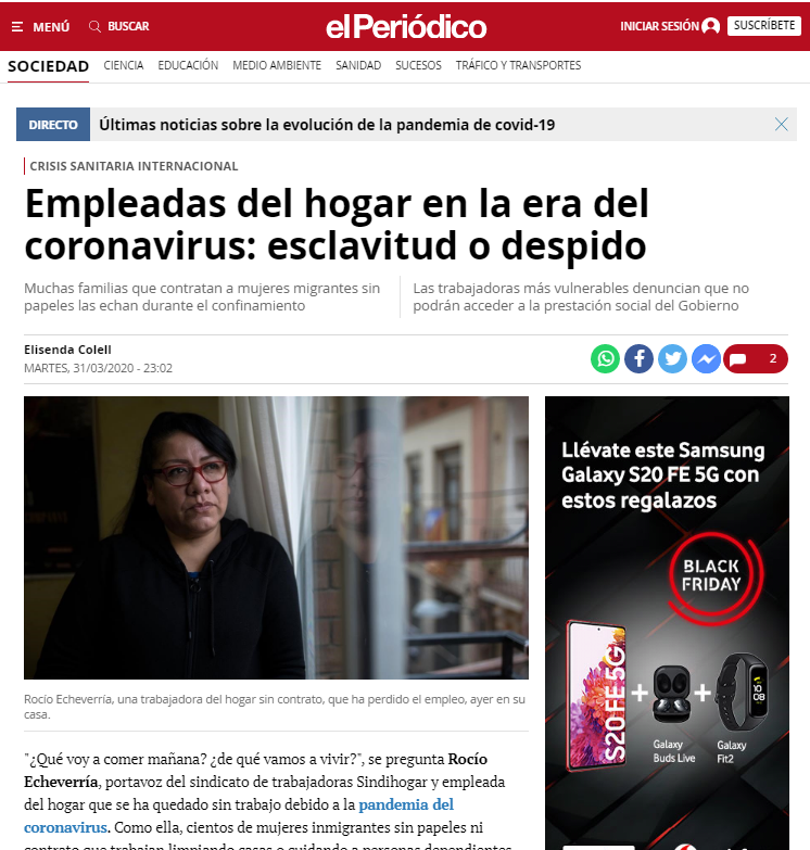 31/03/2020. El periódico La información del periódico aborda la precaria situación que viven las empleadas de hogar y cuidadoras, uno de los colectivos más castigados tras decretarse el estado de alarma. La portavoz del sindicato de trabajadoras Sindihogar y empleada del hogar, Rocío Echeverría, cuenta su propia experiencia ya que ha visto cómo los escasos [...]