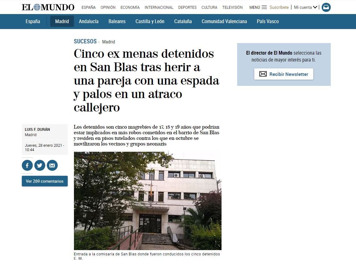 28/01/2021. El Mundo. Nos encontramos ante una pieza que incumple muchos de los criterios para ser considerada una información con un tratamiento adecuado de las migraciones por la falta de mirada crítica hacia la manera en la que muestra o representa la realidad migratoria. En ella, se presenta un suceso ocurrido en Madrid, en el que varios jóvenes han sido detenidos por el atraco y la agresión a [...]
