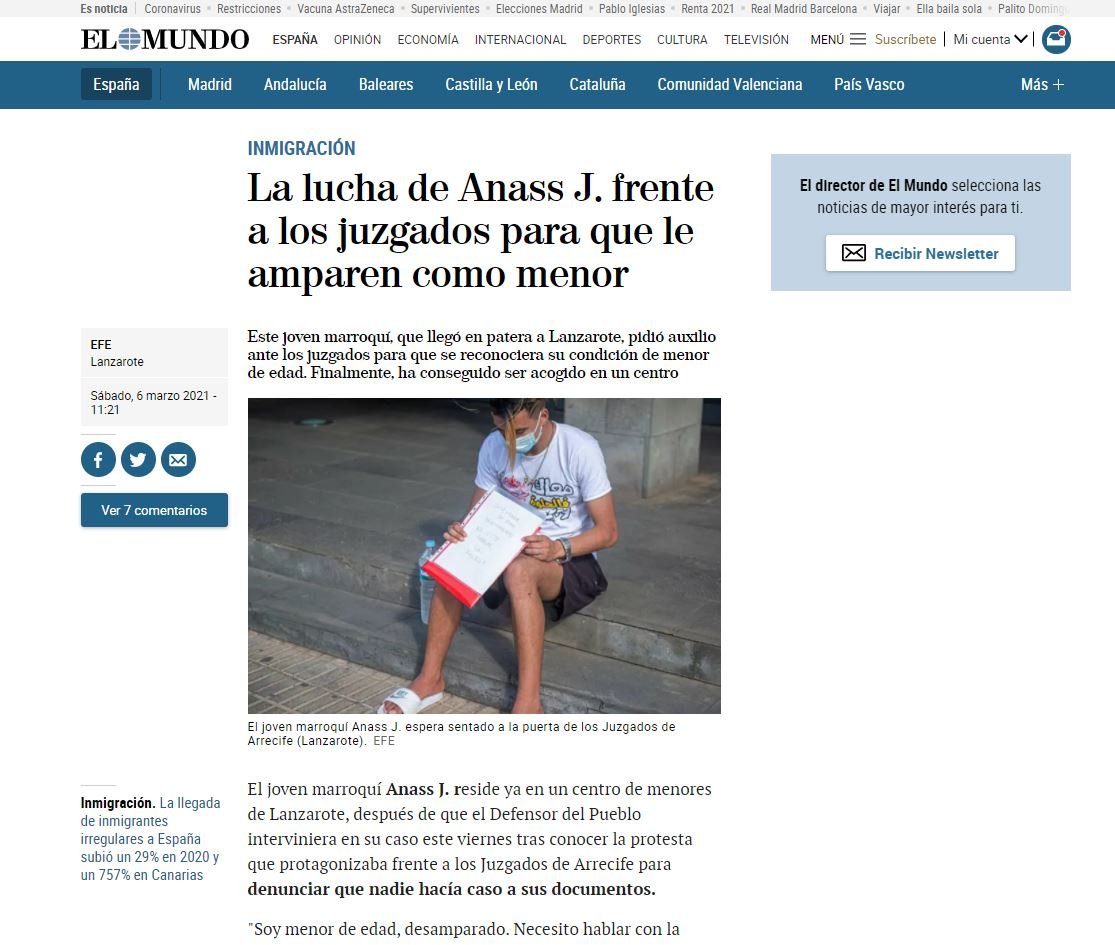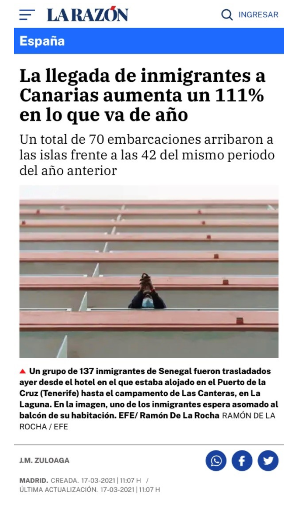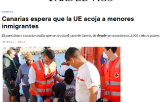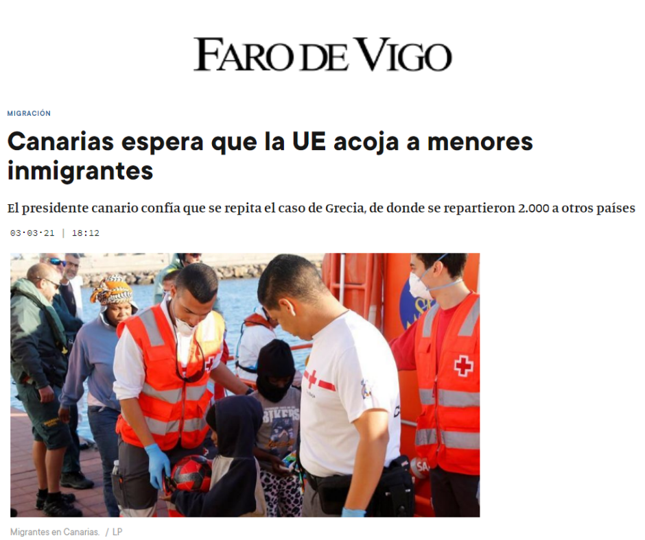 El pasado 3 de marzo, Faro de Vigo publicó una información bajo el titular Canarias espera que la UE acoja a menores inmigrantes en su página web. Se trata de una noticia que recoge declaraciones políticas de representantes canarios sobre la gestión migratoria actual por parte del Estado español y la Unión Europea. Esta pieza [...]