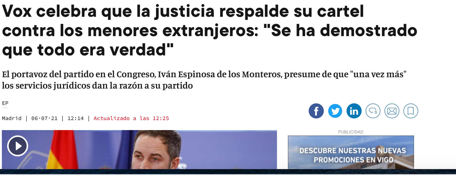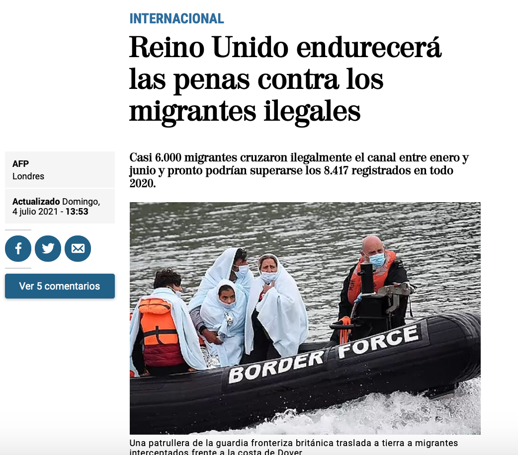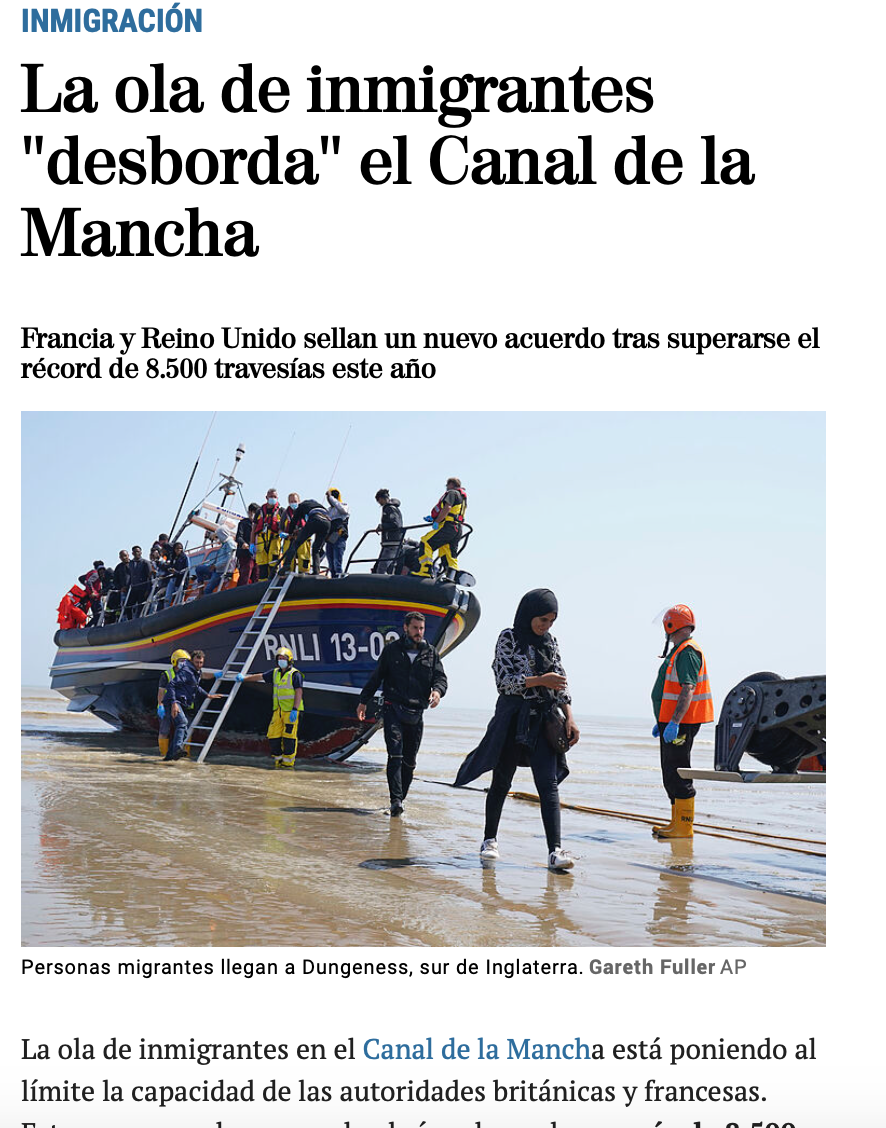 22/07/2021. El Mundo. Esta pieza informa del aumento de llegadas a Reino Unido a través del Canal de la Mancha. La noticia comete una gran cantidad de errores. En primer lugar, destaca el uso del lenguaje metafórico en el titular. Al referirse a las personas migrantes como “olas” que desobordan el canal de la mancha, no solo esta deshumanizando a estas [...]