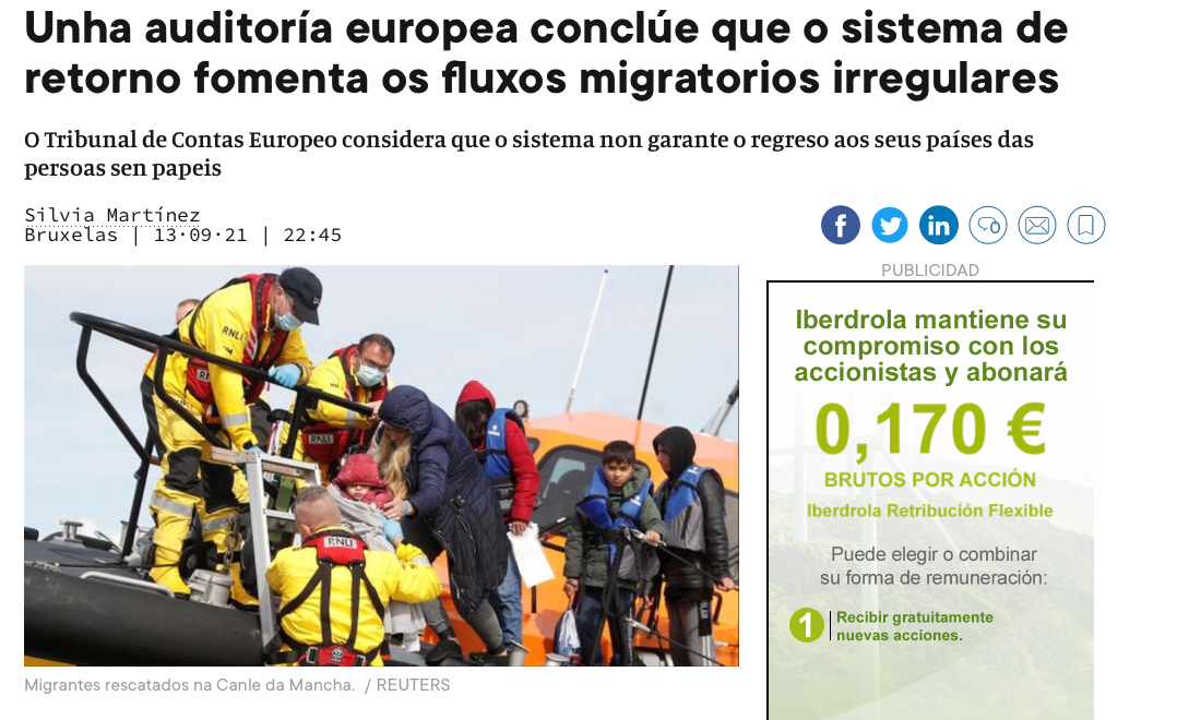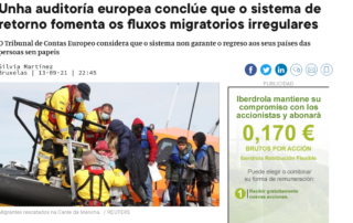 13/09/2021. Faro de Vigo. Faro de Vigopublicó el pasado 13 de septiembre una información bajo el titular Una auditoría europea concluye que el sistema de retorno fomenta los flujos migratorios irregulares. En esta noticia, firmada por el medio, se hacen públicas las conclusiones del Tribunal de Cuentas sobre el sistema de deportación europeo. La información se [...]
