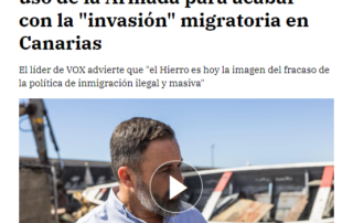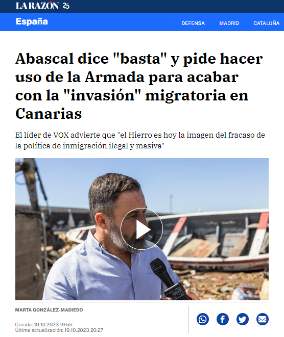 La Razón. 19/10/2023 En esta pieza se presentan las declaraciones del líder del partido ultraderechista Vox, Santiago Abascal. En ellas, el político realiza una serie de afirmaciones sobre las últimas llegadas de embarcaciones al archipiélago canario, que poseen un evidente carácter alarmistas e incendiario. Estas declaraciones, entre las que se [...]